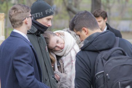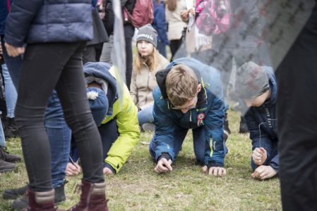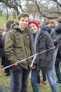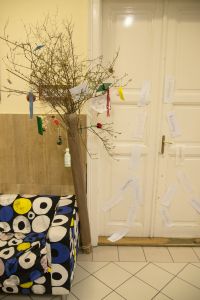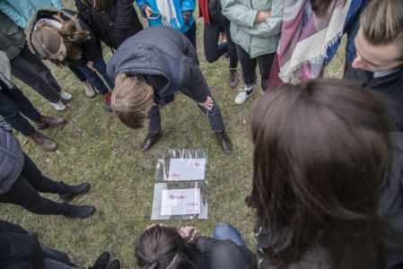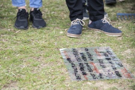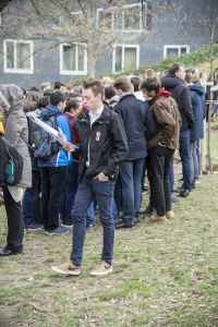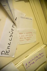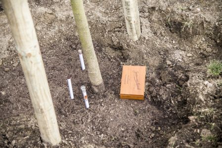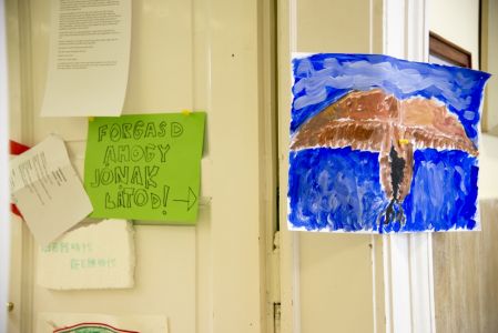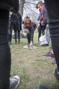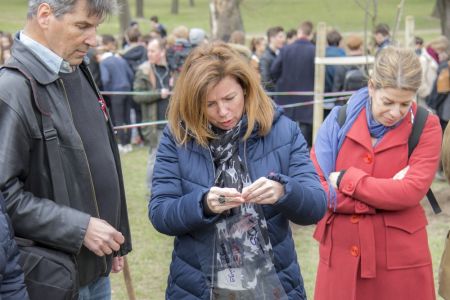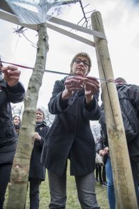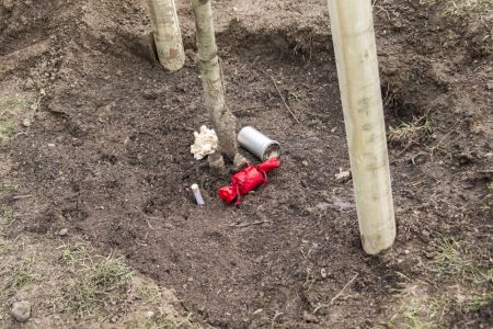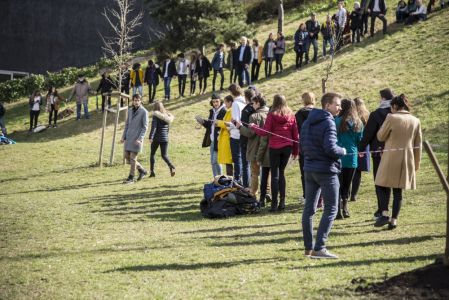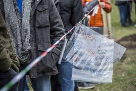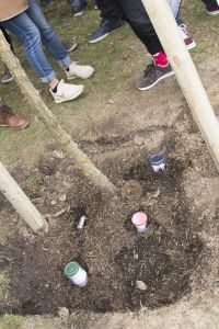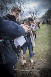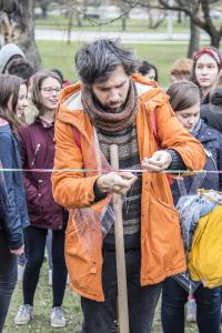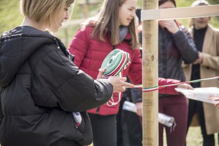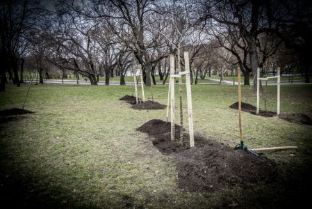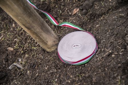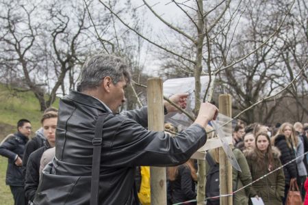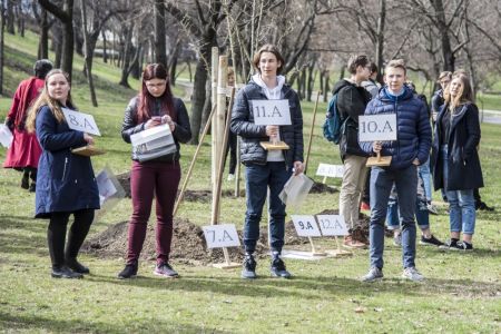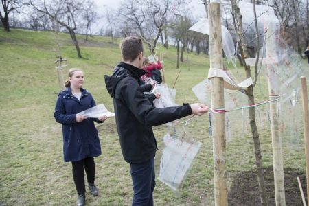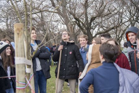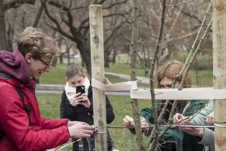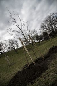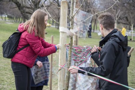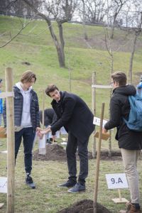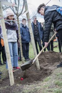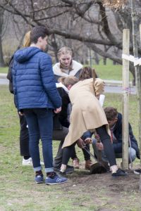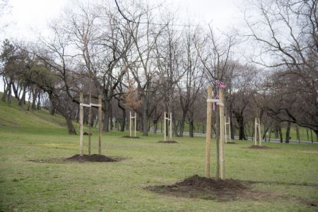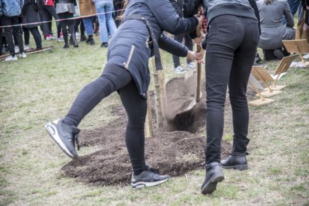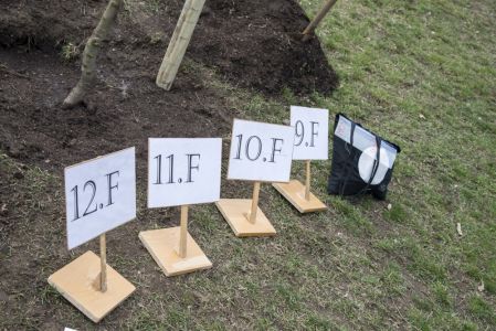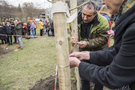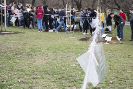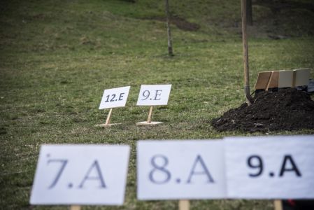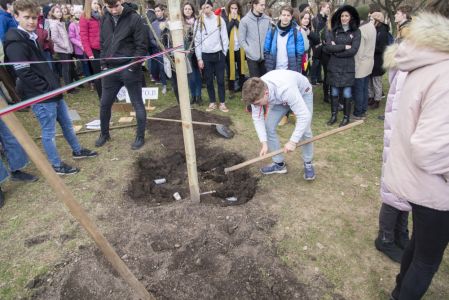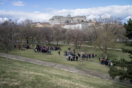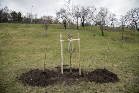 Hát ehelyett kizarándokoltunk ide a Tabánba, hogy a korábban majdnem századmagunkkal kiásott, kicsákányozott, kivájt, majd komposzttal és fekete földdel feltöltött nyolc gödörbe most elültessünk nyolc fácskát.